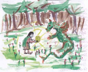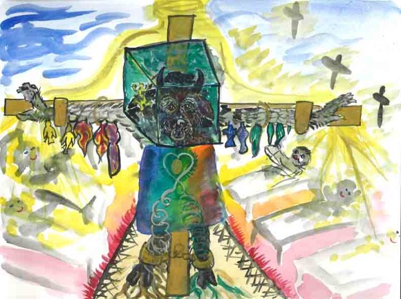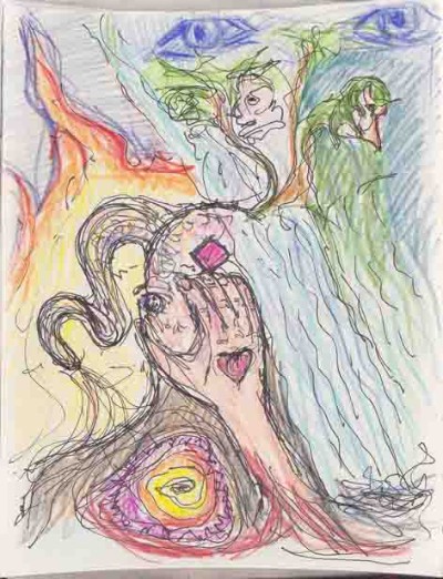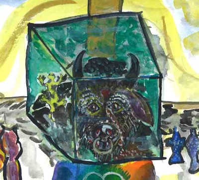 Dieses gequälte Elementarwesen erschien mir mehrmals im Traum. Es ist an ein goldenes Kreuz gekettet. Der Kopf, in einem Plexiglas-Quader ändert ständig seine Form. Es spendet Menschen heilenden Segen an einem Wallfahrtsort, ist selbst jedoch gefesselt und von seiner eigenen Heilkraft abgeschnitten.