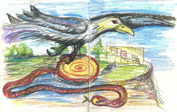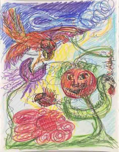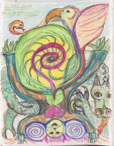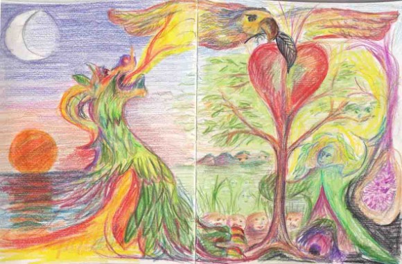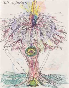 Mutter Erde hält mich fest verwurzelt. Sie nährt mein Herz und die Quelle der neuen Kraft. Das goldene Ei wird am Leben erhalten. Wie mit einer Nabelschnur versorgt die Mutter mein Herz mit Lebenskraft.
