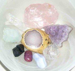 Hergestellt mit folgenden Steinen: blauer Chalcedon, Rubin, Amethyst, Bergkristall, Schörl, Aquamarin, Rosenquarz, Wasserachat, Turmalinquarz.
