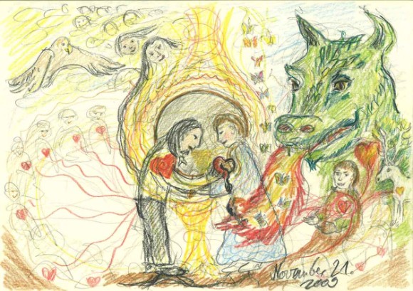 Diese beiden Bilder (oben und unten) entstanden auf Seminaren mit Angaangaq, dem Schamanen aus Grönland, der mit der Aufgabe "das Eis in den Herzen der Menschen zu schmelzen" um die Erde zieht.